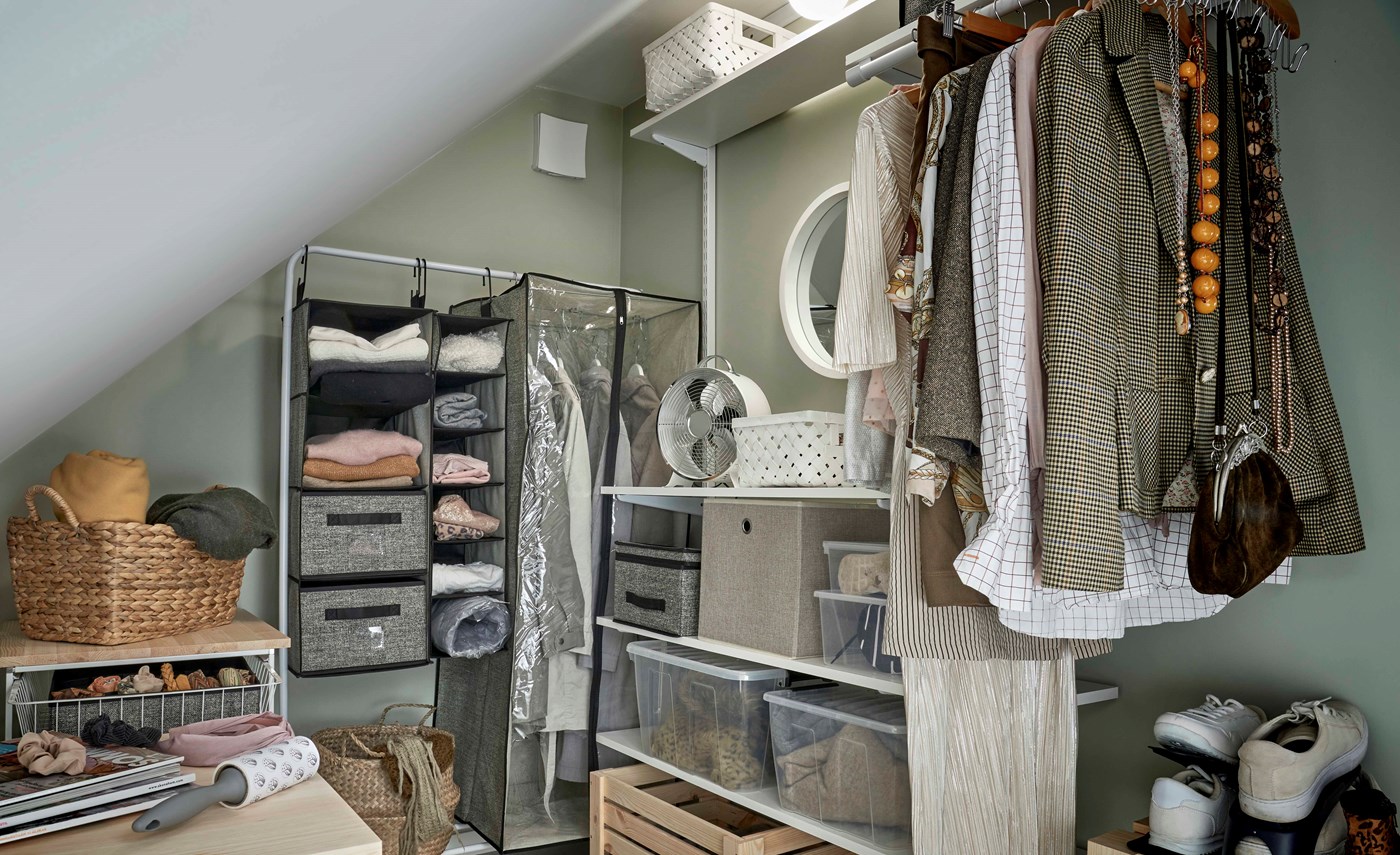 For example, a wire basket with a rack is practical storage solution for a closet: remove the shelves in the closet and place several baskets on top of each other. Vacuum bags with a storage box are also an ingenious accessory for closets and wardrobes. The storage box saves space and protects clothing and other fabrics from moisture, odours, dust, insects, etc.