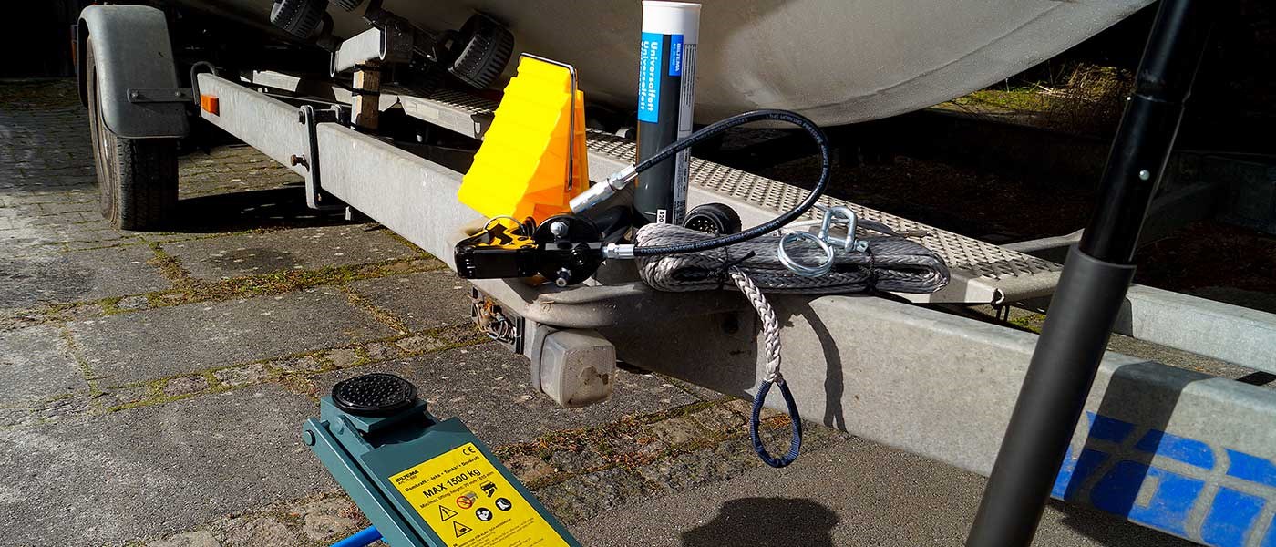 En donkraft er uundværlig ved eftersynet af bådtraileren. Husk at understøtte med bukke og gerne en stopklods så traileren ikke flytter sig.