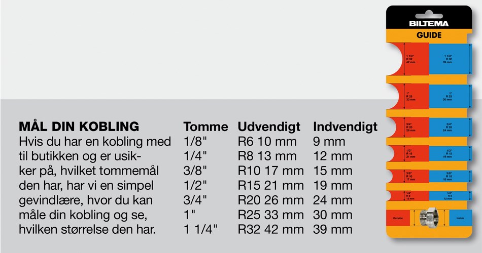 I tabellen nedenfor guider vi dig gennem de forskellige mål i nærmeste hele mm. Gennem årene har tommemålene også fået forskellige navne, for eksempel kan 1/2" gevind også kaldes R15 eller G15.