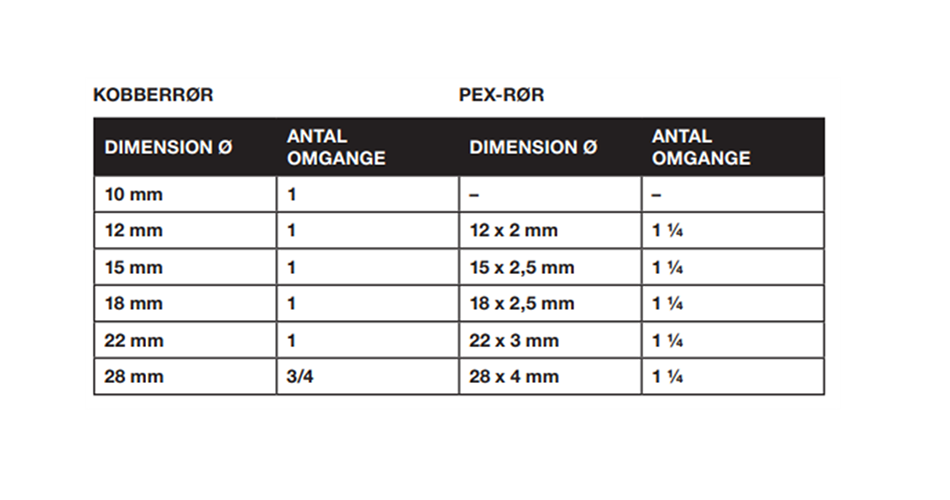 - Spænd først møtrikken med hånden for at modstå. Spænd derefter møtrikken med en fast skruenøgle eller skruenøgle det antal omdrejninger, der er angivet for kobberrør og PEX-rør i nedenstående tabel.