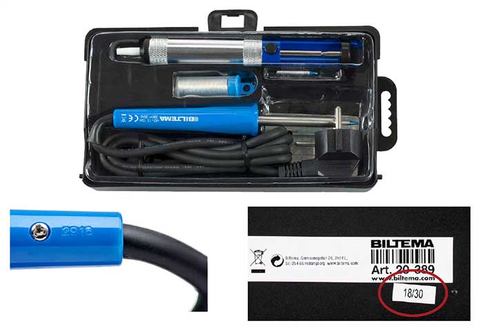 Emballagen er mærket med batchnummer 18/30 på bagsiden i det nederste højre hjørne. Loddepennen er mærket med 2918 på håndtagets nederste del. Se illustrationerne herunder.