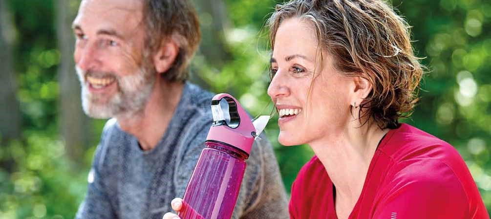 Ældre mand og kvinde iført træningstøj, smiler og nyder en samtale udendørs omgivet af grønne træer.